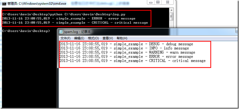 运行一下将会看到CMD窗口只记录两条,spam.log中记录了五条日志